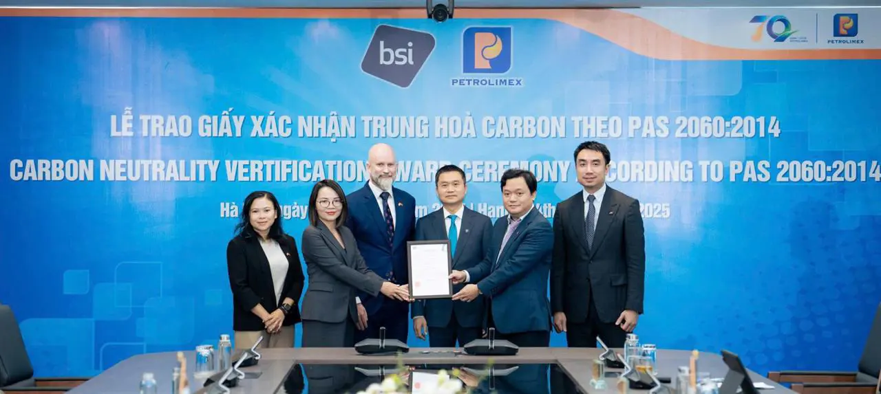 Sáng ngày 14/11, tại Trụ sở Tập đoàn Xăng dầu Việt Nam (Petrolimex/Tập đoàn) đã diễn ra Lễ trao Xác nhận Trung hòa carbon theo tiêu chuẩn quốc tế PAS 2060:2014 do Viện Tiêu chuẩn Anh quốc - BSI cấp, với sự chứng kiến của đại diện Đại sứ quán Vương quốc Anh tại Việt Nam. Sự kiện đánh dấu bước tiến quan trọng trong chiến lược phát triển bền vững và cam kết giảm phát thải khí nhà kính của Petrolimex. Petrolimex là Tập đoàn nhà nước đầu tiên tại Việt Nam nhận giấy Xác nhận Trung Hòa Các bon theo PAS 2060:2014